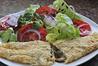 At around 350-400 calories this meal is fast food at its best. I used to be afraid of omelettes - and even tried various versions, such as soufflé style by whisking the egg whites first. Thankfully my partner knew better than me and he makes a fabulous moist and creamy omelette. Break as many eggs (we used 3 per person) as you are going to use into a bowl, add salt and pepper while whisking. No milk (I used to add milk thinking I had to....not any more). We fried the mushrooms before adding - to get rid of the water. Add some butter/oil to the frying pan, heat through and on a medium to high heat, pour in the eggs and stir around to stop the bottom from burning, when almost set, add the flavourings. We used cooked mushrooms and strong cheddar cheese. The secret is simple - don't overcook. We had some toast with ours.