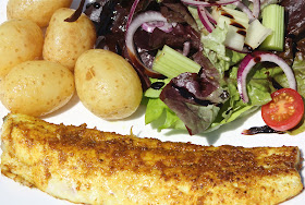 Alternatively use a bought curry powder - but just a mild one. Just a couple of minutes on the bbq and it was moist and delicious. We served ours with a salad dressed in olive oil and some new potatoes with a little butter - both seasoned well. There was 160g of new potatoes and 150g of fish. If you can't get grey mullet, you could use monk fish. This lunch was under 400 calories and very satisfying.