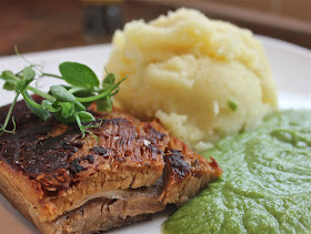 We love the weekend.... Today we've swapped dinner for lunch and are having: twice cooked belly of pork, mash and minted pea puree! I was digging around in the freezer looking for some sausages when I found we still had a couple of portions of pork belly made using the method below. It's quite possible that a few sausages would have more calories and fat, than our slow roasted pork belly! As the pork belly was out of the freezer, it wasn't as moist as it was when fresh, but still tasted fantastic.