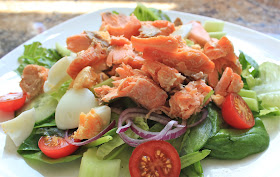 Just a few simple ingredients and I was looking at my tuna, egg and cheese salad with new potatoes... with delight. At under 450 calories, this is a perfect lunch. Very filling and delicious.