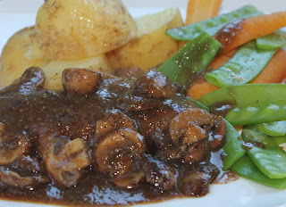 We had some mushroom gravy left over from our dinner the other day, and this went perfectly with a small chicken breast, some potatoes, carrots and mange tout.