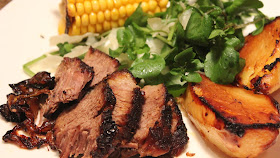 It cooked for around 4 hours at 120 degrees C. When we arrived home, we put in a couple of peeled potatoes (hoping for good tasty roasters - which turned out devine) and after half an hour, added some sweetcorn cobs. We wanted to finish the beef on the bbq, but it was quite chilly and we decided to stay indoors. Nothing suffered as a result, because all the flavour just poured from the pan...