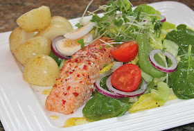 Here's our quick lunch. This was half a pack of salmon (with chilli flakes) and 120g of new potatoes (in a little butter). If I didn't have the time to cook the potatoes, I would probably have bought some ready prepared.