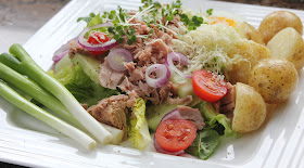 This is one of our favourite salads. I suppose it's a simple dish that can be assembled quite quickly. We had the salad ingredients, and very little else - until I remembered the can of tuna. If I hadn't had the potatoes, I would have had some bread.