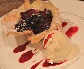 I also used one large eating apple rather than using cooking apples. The apple was sweet and therefore I didn't need to add extra sugar. We used just one sheet of filo pastry for each dessert (50 calories), cutting it into four, brushing the layers with melted butter and shaping it into a muffin tin. We filled the moulds with the half cooked blackberry and apple mix (which had been stewed in its own juices in a pan for 10 minutes and left to cool slightly). I drained the juice into a separate pan and reduced into a coulis (without adding any icing sugar). Seasonal fruit is often so much sweeter, so less sugar is needed and this helped keep the calories down.