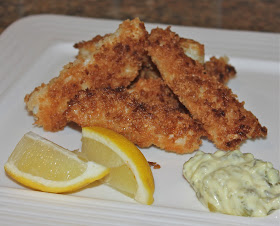 We cut the haddock into 6 large fingers (or goujons if you want to be posh) with around 25g of fish each. These were dipped into seasoned flour, egg and then covered in Panko breadcrumbs (also from the supermarket). We're quite impressed with Panko breadcrumbs because they give a very crispy result without soaking up lots of oil. The drier texture is so much crunchier than if we used normal breadcrumbs. They took just a few minutes each side to shallow fry in the frying pan. We shared our starter and ate with some mayonnaise which was pepped up with cornichons (gherkins) and capers.