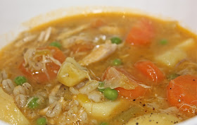 I made this delicious chicken soup today and as we were busy, we ate it for dinner instead of lunch. I didn't make the dumplings this time either. There is nothing quite like the flavour of home made soup using your own stock. Yes, it's a bit of a fiddle, but worth the effort. Just cover the chicken carcass in water and simmer for an hour to extract all the flavour.