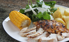 Here's one of our favourite meals - and it's very filling. For the two of us we generally roast half a chicken. Not only does this save waste, but it's cheaper. If we didn't have half a chicken, we would use chicken breast and pan fry. We love serving our spicy chicken with boiled new potatoes (and a little butter), sweet corn cobs and a green salad with parmesan.