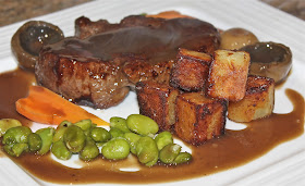 The potatoes were devine - cooked in oil and a smidge of garlic in the frying pan. We have the recipe for the absolutely delicious chasseur sauce here on the blog. The steak is as we like it - resting the meat is probably the most important lesson to learn (as the juices return to the meat and do not run over the plate). Carrots and broad beans... that's it. In a restaurant you would pay a price for something as delicious. We washed it down with a very good glass of red wine... house wine here is very good value for money too.