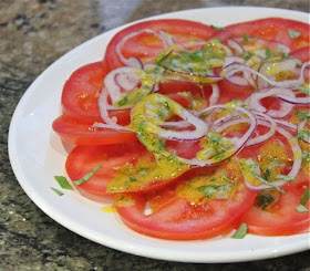 Arrange the tomatoes on a plate and top with the onions. Drizzle with the dressing and season with salt and pepper if needed.